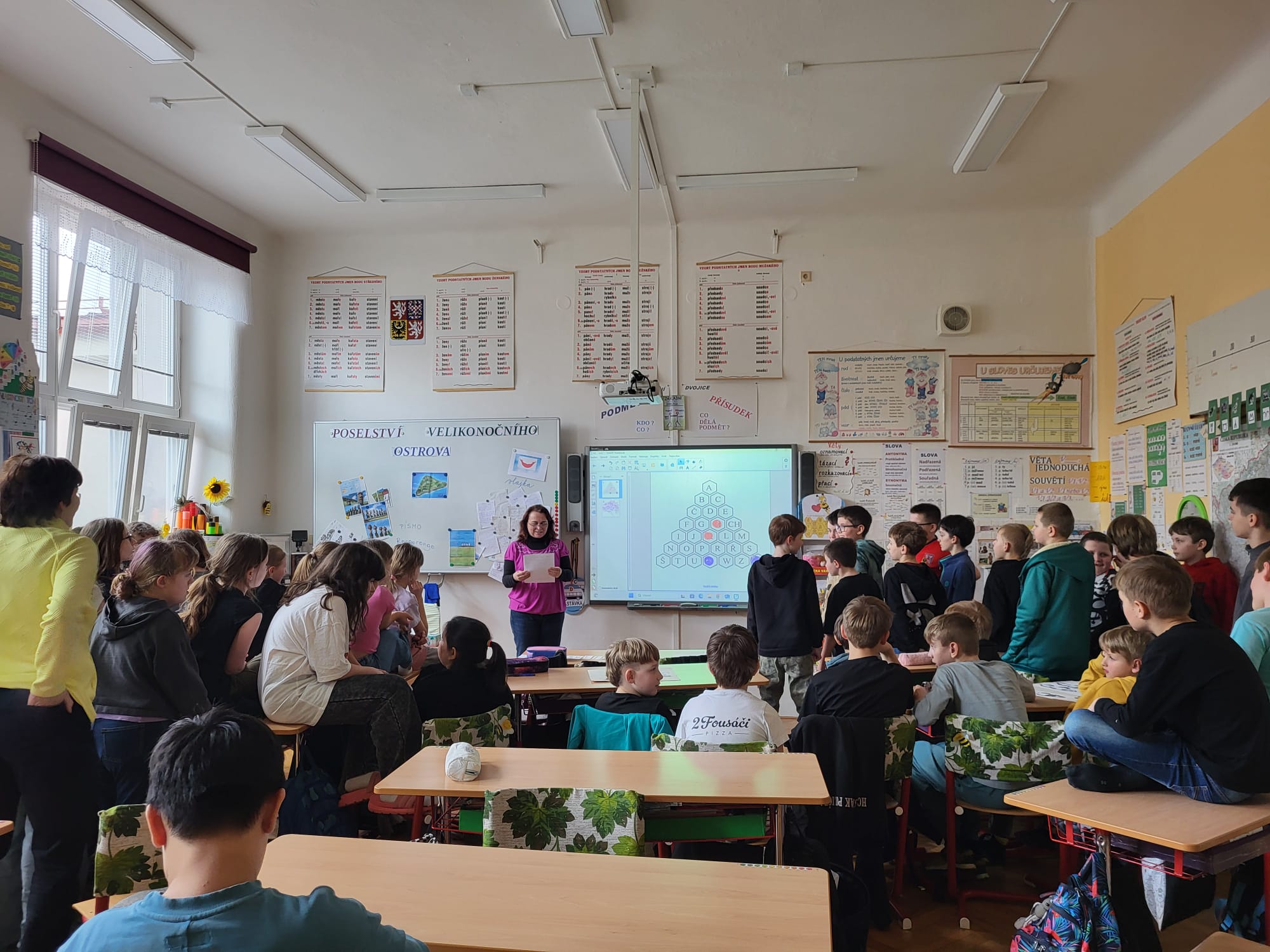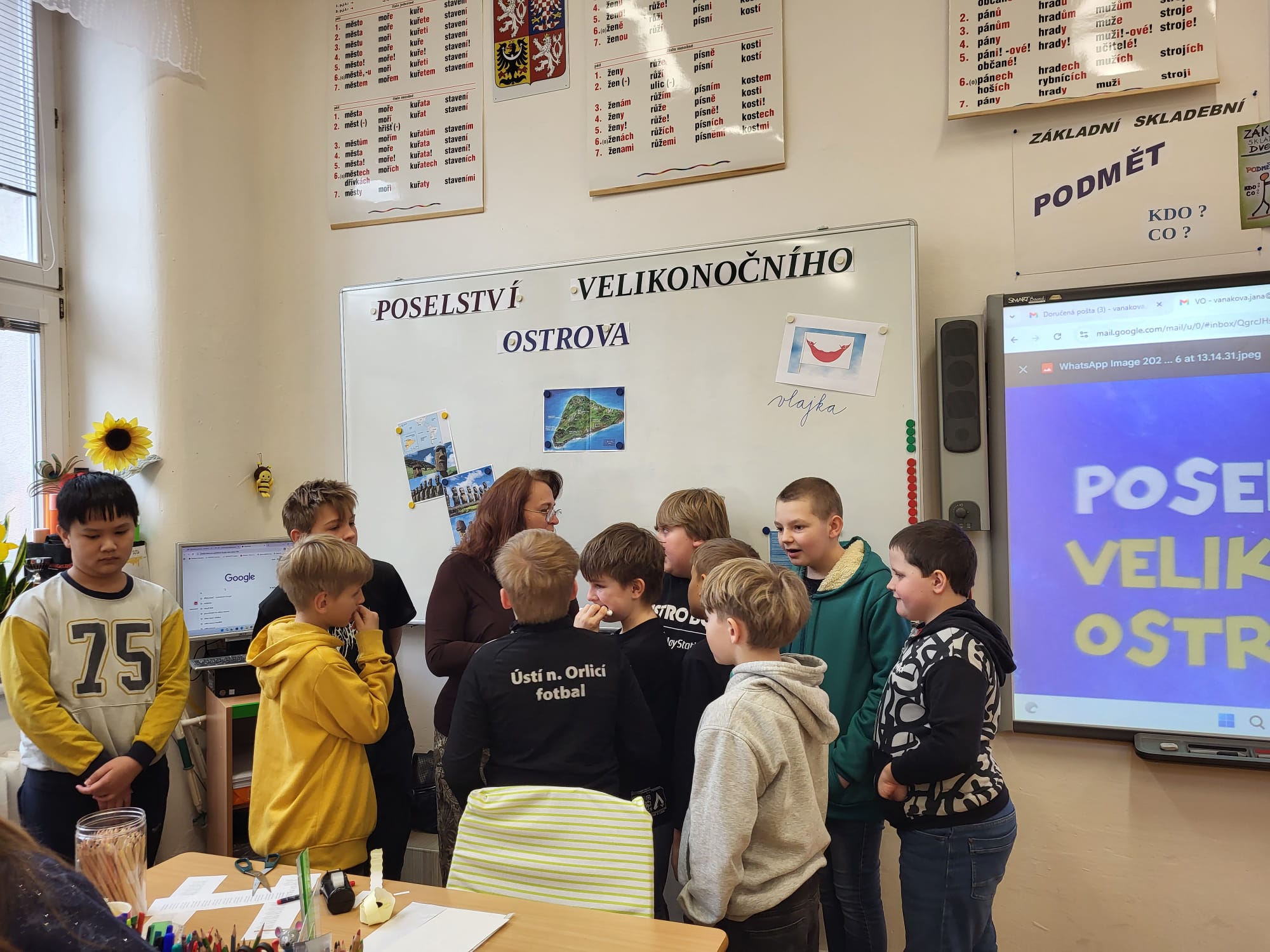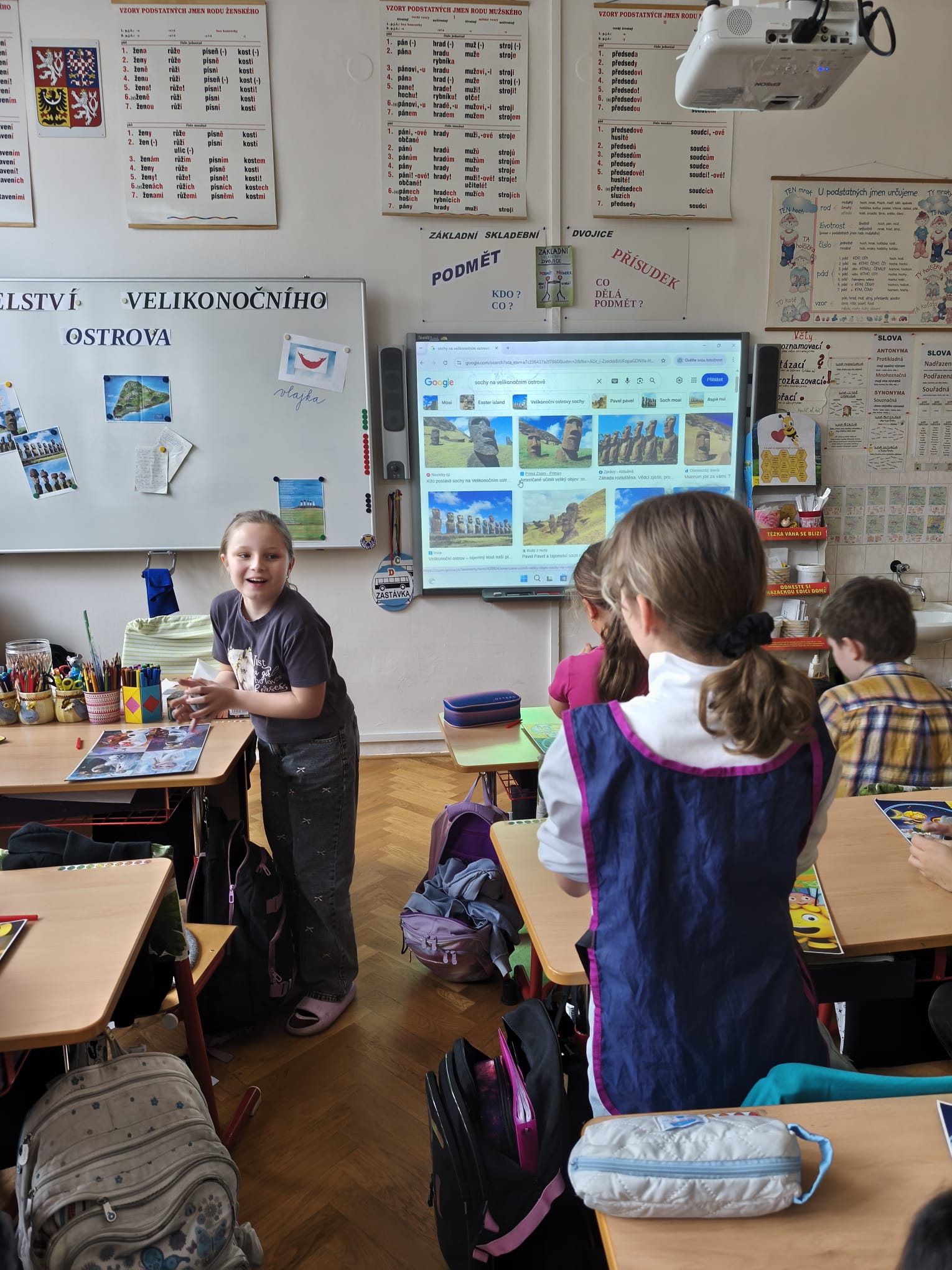 Třídy 4.C a 5.A se letos zabývaly Velikonocemi v ekologickém duchu, ponořily se do zajímavého a objevného projektu, kde cílem bylo propojit různé vzdělávací oblasti, rozvíjet spolupráci i tvořivost a přiblížit žákům jedinečnou kulturu tohoto tajemného místa. Projekt jsme zahájili čtenářskými dílnami, během nichž se žáci seznamovali s texty o Velikonočním ostrově, jeho historií, obyvatelích i záhadných sochách moai. Děti pracovaly s informacemi, vyhledávaly klíčová fakta a sdílely své poznatky ve skupinách. Součástí úvodu bylo také zhlédnutí cestopisného videa a krátkých filmů o záhadách ostrova, které dětem pomohly lépe si představit prostředí i atmosféru tohoto odlehlého místa. Na čtení navazovaly matematické úlohy tematicky zaměřené na dané prostředí – žáci řešili například úlohy spojené s počtem soch, jejich hmotnostmi, vzdálenostmi nebo logickými problémy. Nechyběly ani pohybové hry, které přinesly do výuky radost a energii a zároveň rozvíjely týmovou spolupráci. Velký úspěch měla práce s obrázkovou osnovou vytvořenou ze zoom fotografií, díky níž si děti skládaly příběh a učily se strukturovat informace. Zajímavým zpestřením bylo také seznámení s tajemným písmem Rongorongo, které podnítilo fantazii a vedlo k vlastním pokusům o „psaní“. Součástí projektu byly i problémové situace, při nichž žáci hledali řešení různých výzev, a praktická činnost – modelování soch moai z moduritu. V návaznosti na poznatky o přemísťování soch se žáci seznámili s teorií a pokusy inženýra Pavla Pavla, který se zabýval způsobem jejich přesunu. Děti si tuto činnost samy vyzkoušely – své modely sošek se pokoušely posouvat pomocí pastelek namísto kulánů a hledaly nejefektivnější způsob „přepravy“. Pracovní listy pomáhaly upevnit získané znalosti a dovednosti. Velmi zajímavou aktivitou bylo také vytvoření vlastní „cestovní kanceláře“, kde žáci prezentovali Velikonoční ostrov jako turistickou destinaci a rozvíjeli své komunikační a prezentační schopnosti s pomocí digitální technologie.. Celý projekt byl zakončen AZ kvízem, ve kterém si žáci ověřili své znalosti zábavnou formou. Ukázalo se, že si děti odnesly nejen mnoho nových informací, ale také spoustu zážitků a radosti ze společné práce. Tento projekt však nepřinesl jen poznání historie a kultury, ale především důležité zamyšlení nad vztahem člověka k přírodě. Na příběhu tohoto ostrova si žáci uvědomili, jak může nešetrné zacházení s přírodními zdroji vést k jejich vyčerpání a negativně ovlivnit život celé společnosti. Děti tak pochopily, že ochrana životního prostředí má zásadní význam i v dnešní době. Projekt v nich podpořil odpovědnost za vlastní chování a vedl je k uvědomění, že každý z nás může přispět k ochraně naší planety. Projekt byl pro všechny zúčastněné inspirativní zkušeností a ukázal, jak může být učení pestré, propojené a smysluplné.
