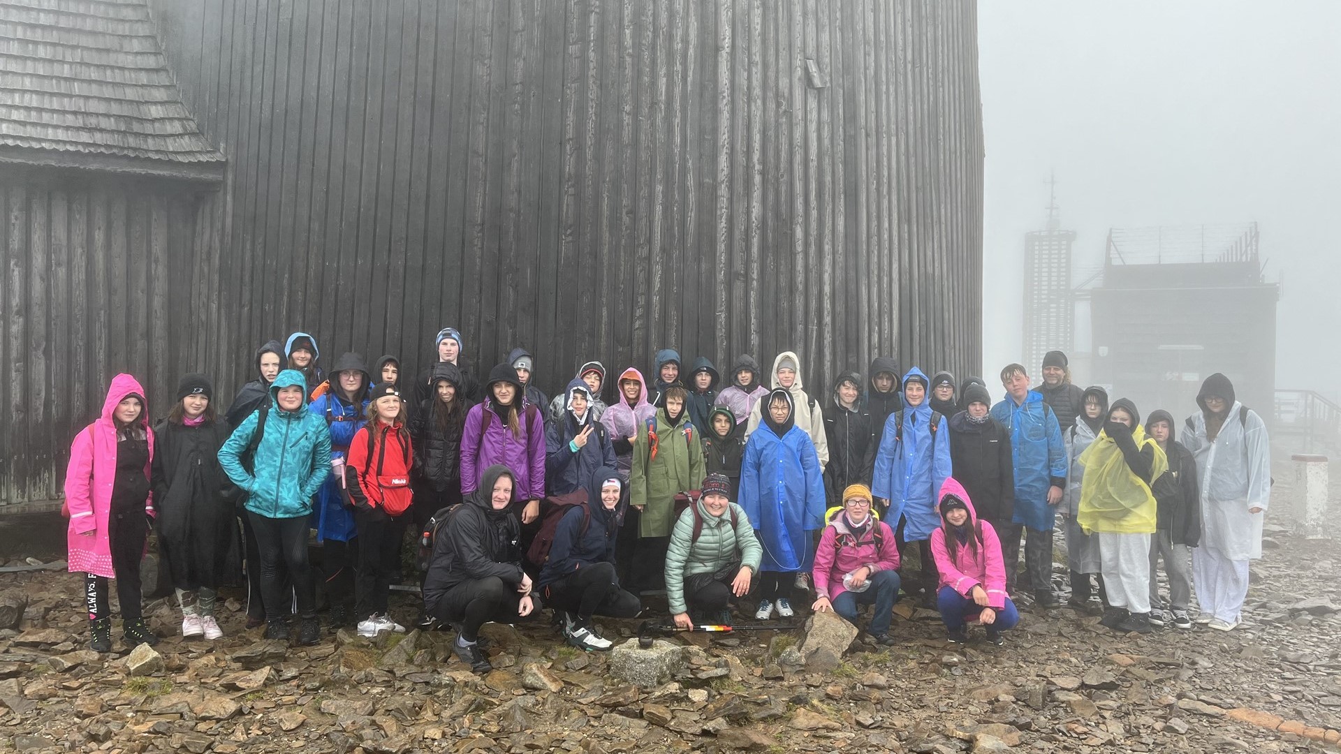 Jednoho deštivého rána třídy 8.C a 8.A vyrazili na Sněžku. Už na začátku túry bylo všem jasné, že výhled bude úplně tragický, protože všude kolem nás byla mlha. Chvíli po náročné chůzi do kopce na nás přišla velká únava. Čím výše jsme se dostávali, tím větší zima nám byla, déšť byl také větší a vítr začal přidávat na síle. Celý výšlap zakončila velká bolest nohou.